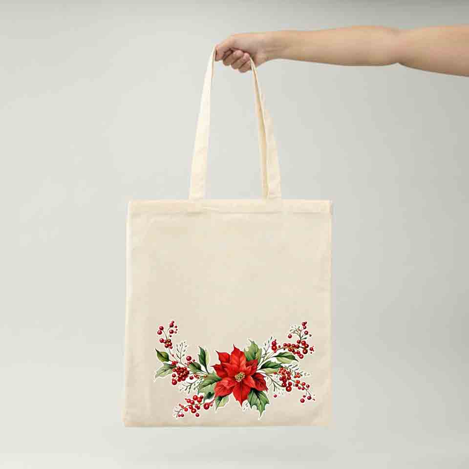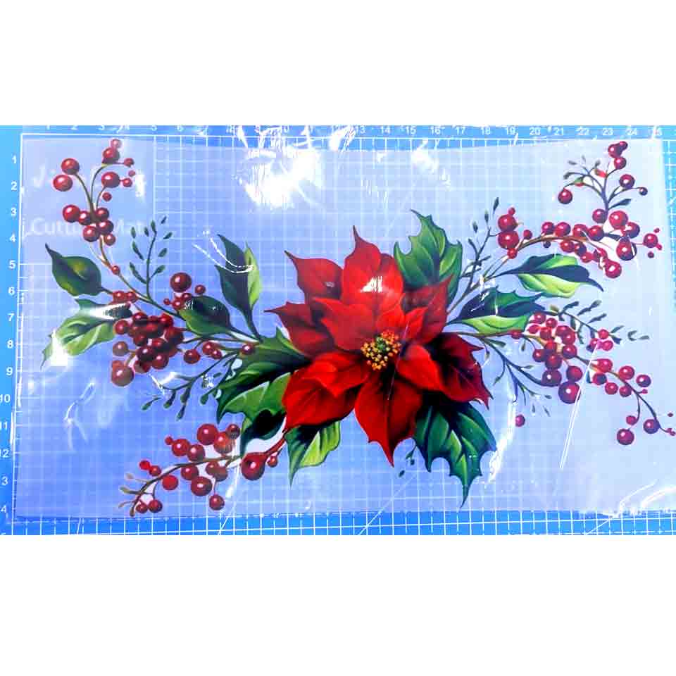 Dale un toque festivo y sofisticado a tus proyectos textiles con este transfer DTF (Direct to Film) con diseño de flor de Navidad acompañada de ramas y bayas rojas.